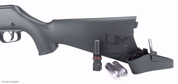 Plinking has never been cooler than it is now with the Umarex Canex. With three 10-shot magazines in the box, you can load up the rifle with fresh CO2 and 30 .177 caliber pellets in the magazine and let those tin cans know who's the top shot. The Canex is powered by two 12 gram CO2 cartridges and uses an easy change disk magazine system. The Canex launches alloy pellets at 800 FPS and 7 grain lead pellets at 700 FPS.